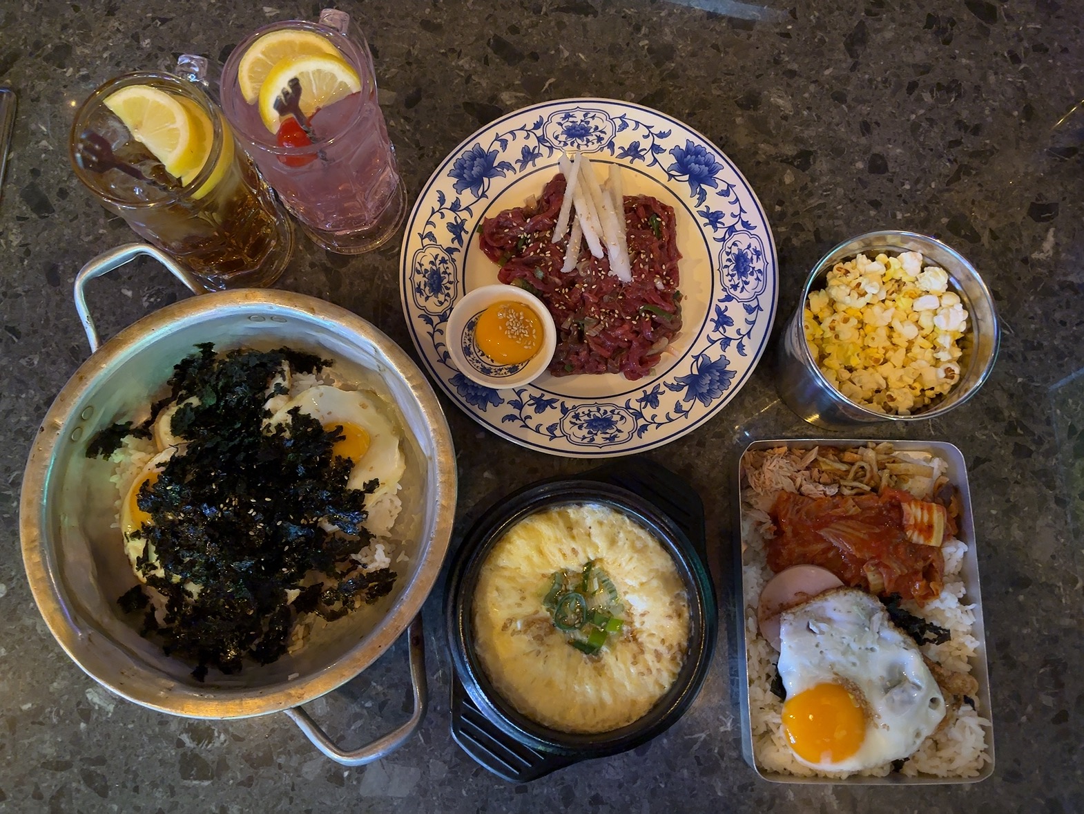 한우육회, 추억의 도시락, 체리 블러썸 하이볼, 얼그레이 하이볼, 계란찜, 간장 폭탄 계란밥 (기본 테이블 세팅 팝콘 줬습니다)